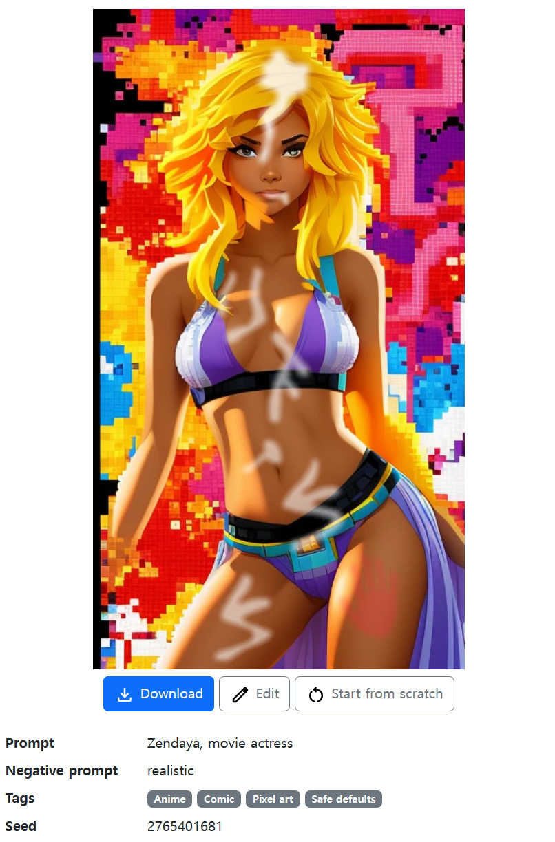 어떤 AI 생성 웹사이트에서 단어만을 입력해서 생성한 '젠데이야 (Zendaya)' 이미지 (+ 필자가 약간 수정함). Prompt에 입력한 단어와 설정은 그림 아래에 있음.