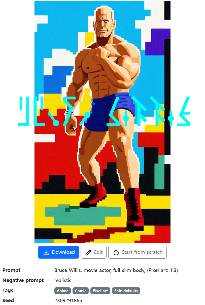 어떤 AI 생성 웹사이트에서 단어만을 입력해서 생성한 '브루스 윌리스 (Bruce Willis)' 이미지 (+ 필자가 약간 수정함). Prompt에 입력한 단어와 설정은 그림 아래에 있음.